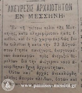 Συνέχισα να ξεφυλλίζω και έπεσα πάνω… σε αρχαία. Στις 5 Ιουλίου δημοσιεύονται πληροφορίες σύμφωνα με τις οποίες κατά τη διάρκεια των εκσκαφών για τα θεμέλια βρέθηκε ένα πλήθος αντικειμένων και υλικών που μαρτυρούσε την οίκηση του χώρου από την αρχαιότητα μέχρι και την Ενετοκρατία: “Εν τη γείτονι πόλει της Μεσσήνης, καθά πληροφορούσιν ημάς εκείθεν, και εν τω χώρω ακριβώς ένθα τελείται η κατά την 23 Αυγούστου ετήσια πανήγυρις, ενεργουμένων ανασκαφών προς ανόρυξιν θεμελίων δια την ανέγερσιν ναού ανευρέθησαν ίχνη αρχαιοτήτων.