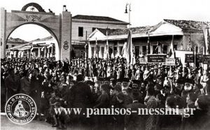 [Στη φωτογραφία (από το λεύκωμα των ΓΑΚ Μεσσηνίας) τα “δημοτικά μαγαζία” την ημέρα που ο δικτάτορας Μεταξάς επισκέφθηκε το Νησί στις 26 Απριλίου 1939. Τα αρχιτεκτονικά στοιχεία του κτηρίου παρουσιάζουν ομοιότητα με αυτά του (παλιού) Δημαρχείου]