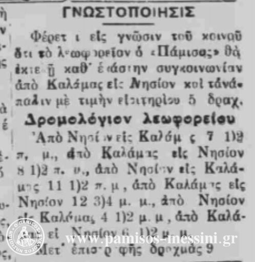 Το καλοκαίρι του 1931 η πρώτη γνωστοποίηση-διαφήμιση των δρομολογίων Μεσσήνη – Καλαμάτα του λεωφορείου «Ο Πάμισος» [«Σημαία» 2/6/1931]