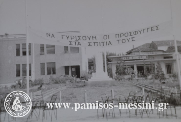 Μεσσήνη, Ιούλιος 1975, συμπαράσταση στον αγώνα των Κυπρίων. Πείσαμε τότε το δήμαρχο Δ. Κούτσικα και κατασκεύασε ο δήμος περίπτερα στο πάρκο όπου κάναμε με το Σύλλογο Μεσσηνίων Φοιτητών μια έκθεση φωτογραφίας με υλικό από την εισβολή. Και κατασκευάσαμε πανώ που κρεμάστηκαν από τις υπηρεσίες του δήμου σε κεντρικά σημεία της πόλης. Ενα από αυτά για τους πρόσφυγες, στη βόρεια πλευρά της πλατείας…