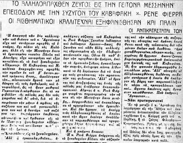 το περιστατικό που γράφω έγινε το 1932 στο ξενοδοχείο «Πάμισος» και έχω αποδελτιώσει το δημοσίευμα από το «Θάρρος». Δυστυχώς η «Σημαία» δεν διαβάζεται γιατί το φύλλο είναι κακοτυπωμένο αλλά εκείνο που διέκρινα είναι πως ο συντάκτης της είχε χωθεί στο δωμάτιο και περιγράφει από πρώτο χέρι το γυναικοκαυγά…
