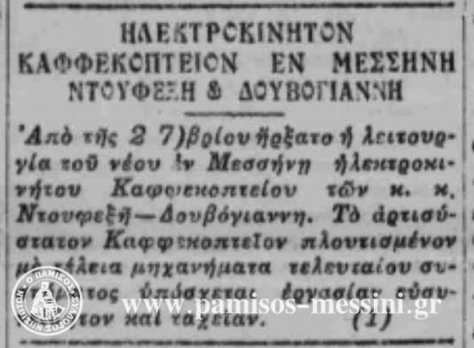 Μπορεί στα 1925 το Νησί να μην είχε ηλεκτροφωτισμό, είχε όμως ηλεκτροκίνητο «καφφεκοπτείον» που λειτουργούσαν οι Ντουφεξής και Δουβόγιαννης. Υπάρχει μια εξήγηση, Ντουφεξής ήταν ο πρώτος που πρότεινε στο δήμο τον ηλεκτροφωτισμό της πόλης στις αρχές του 20ου αιώνα., Ντουφεξής συναντιέται συνεταίρος του Νίκου Πετρόπουλου (καλλιτέχνη) σε ελαιοτριβείο, φαίνεται ότι υπήρχε «ηλεκτρομηχανολογική» τεχνογνωσία. Κατά τη διαφήμιση «το αρτισύστατον καφφεκοπτείον πλουτισμένον με τέλεια μηχανήματα τελευταίου συστήματος υπόσχεται εργασίαν ευσυνείδητον και ταχείαν»…