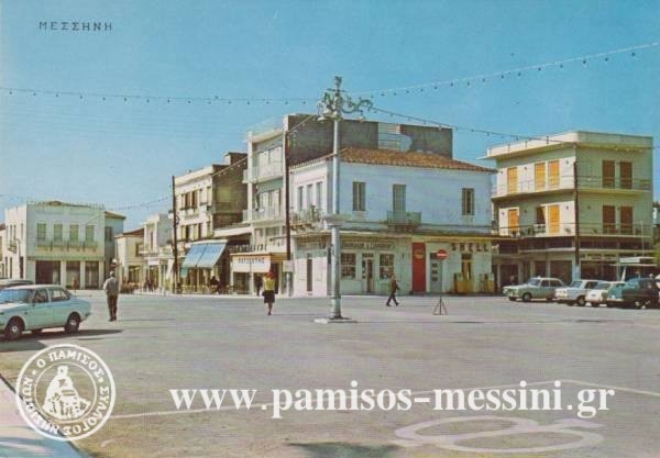 Η κάτω πλατεία της Μεσσήνης με τα καταστήματα στις αρχές του 20ου αιώνα. Στο βάθος το κτήριο που σώζεται και σήμερα, το οποίο στέγασε για 25 χρόνια το ιστορικό ξενοδοχείο “Πάμισος” των αδελφών Χρόνη. Λειτούργησε για πρώτη φορά το 1903, τις ημέρες που ξεκινούσε το πανηγύρι και διαβάζουμε στο “Θάρρος”: “Απαστράπτον εκ καθαριότητος ήνοιξε τας πύλας νέον ξενοδοχείον ύπνου και φαγητού ο “Πάμισος” παρά τη κάτω πλατεία και εν τη οικία Παν. Μπουγέα.