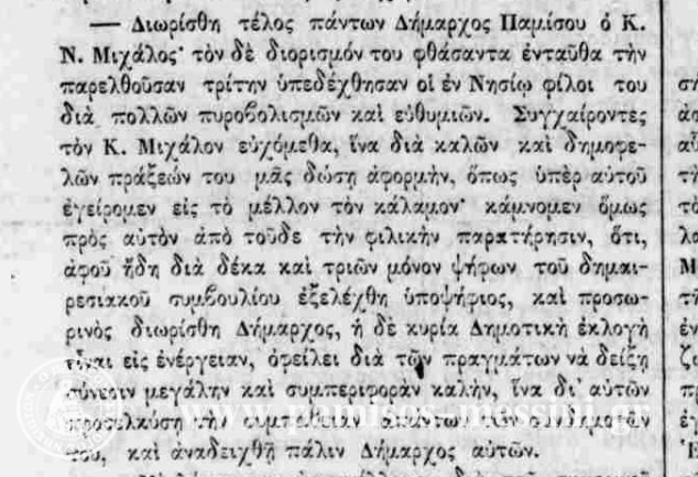 Ο διάδοχος του Γεωργίου Δαρειώτη αργεί να επιλεγεί και τελικά διορίζεται προσωρινά δήμαρχος ο Νικόλαος Μιχάλος μετά από μήνες, ενώ είναι σε εξέλιξη η διαδικασία για την κανονική εκλογή δημάρχου. Η οποία αναβάλλεται διαρκώς λόγω της διεξαγωγής των βουλευτικών εκλογών. Στην εκλογή συγκέντρωσε μικρό αριθμό ψήφων και η καλαματιανή εφημερίδα “Πελοπόννησος” το επισημαίνει ότι θα πρέπει να επιδείξει σύνεση για να πείσει τους Νησιώτες να τον εκλέξουν πάλι δήμαρχο στην “κύρια δημοτική εκλογή”: “Διωρίσθη τέλος πάντων Δήμαρχος Παμίσου ο κ. Ν. Μιχάλος, τον δε δκιορισμόν του φθάσαντα ενταύθα την παρελθούσαν Τρίτην υπεδέχθησαν οι εν Νησίω φίλοι του δια πολλών πυροβολισμών και ευθυμιών. Συγχαίρομεν τον κ. Μιχάλον, ευχόμενοι ίνα δια καλών και δημοφελών πράξεών του μας δώση αφορμήν όπως υπέρ αυτού εγείρομεν και εις το μέλλον τον κάλαμον. Κάμνομεν όμως προς αυτόν από τούδε την φιλικήν παρατήρησιν, αφού ήδη δια 13 μόνον ψήφων του δημαιρεσιακού συμβουλίου εξελέγχθη υποψήφιος και προσωρινώς διορίσθη δήμαρχος, η δε κύρια δημοτική εκλογή είναι εις ενέργειαν, οφείλει δια των πραγμάτων να δείξει σύνεσιν μεγάλην και συμπεριφοράν καλήν, ίνα δι’ αυτών προσελκύση την συμπάθειαν απάντων των συνδημοτών και αναδειχθεί και πάλι δήμαρχος αυτών” (“Πελοπόννησος” 5/1/1861).
