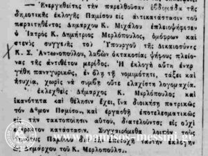 Ο εκλεχθείς δήμαρχος κ. Μερλόπουλος και ικανότητα και θέλησιν έχει, ίνα διοικήσει πατρικώς τον Δήμον Παμίσου και να εργασθή αποτελεσματικώς εις την τακτοποίησιν αυτού, διατελούντος εις ουχί ευάρεστον κατάστασιν (“Πελοπόννησος” 13/11/1868).