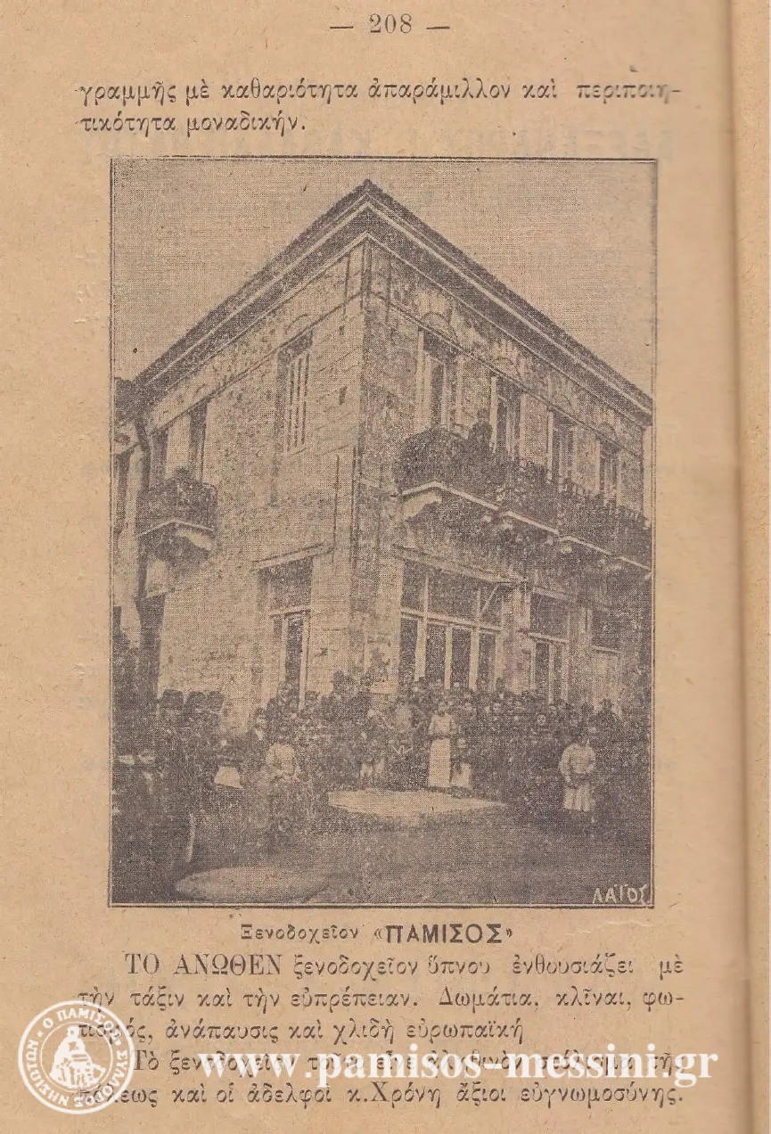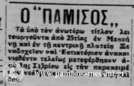 Αγγελία-διαφήμιση το 1929 («Σημαία» 3/9) για τη μεταφορά του ιστορικού ξενοδοχείου «Πάμισος» σε άλλη θέση: «Τα υπό τον ανωτέρω τίτλον λειτουργούντα από 25ετίας εν Μεσσήνη και εν τη κεντρική πλατεία ξενοδοχείον και εστιατόριον ανακαινισθέντα τελε΄πιως μετεφέρθησαν από 1ης Σεπτεμβρίου εις την παρακειμένην οικίαν Γαργαλίδου»…