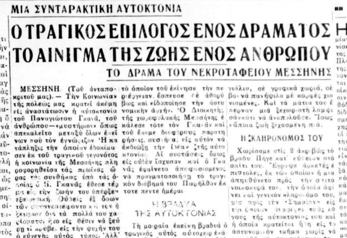 Ούτως είχον τα πράγματα ότε προ ημερών ο Γκανάς μεταβάς εις το νεκροταφείον του Αγίου Γεωργίου εξέλεξε ωρισμένον χώρον εις αρκετά εμφανές μέρος και αφού τον ηγόρασε παρήγγειλεν εις την υπηρεσίαν του νεκροταφείου να ανασκάψη εκεί ΄να τάφον διότι – ως είπεν – κάποιος συγγενής του επρόκειτο να ταφή. Ο τάφος πράγματι ητοιμάσθη, αφού δε περιεφράχθη με κάγγελα ο Γκανάς μετέβη και ετποποθέτησε σταυρόν επί του οποίου ανέγραψε το όνομά του, το έτος γεννήσεως και την ημερομηνίαν θανάτου του. Η ημερομηνία αύτη ήτο 10-101938. Ο νεκροθάπτης του νεκροταφείου είδε ότι το πράγμα το οποίον του εκίνησε την περιέργειαν, έσπευσε δε αθορύβως και ειδοποίησε την αστυνομικήν αρχήν. Ο Διοικητής της Χωροφυλακής Μεσσήνης εκάλεσε τότε τον Γκανάν και του έκαμε διαφόρους παρατηρήσεις, συστήσας εις αυτόν να εκδιώξη την ιδέαν της αυτοκτονίας. Αι συστάσεις όμως εις ουδέν ίσχυσαν και ο Γκανάς εφαίνετο αποφασισμένος να πραγματοποιήση το τραγικόν διάβημά του. Παρήλθαν έκτοτε πέντε ημέραι.