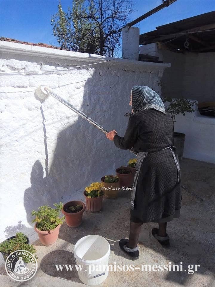 Τα παλια χρονια το σκουπισμα του σπιτιου, της αυλης των δρομων και των πεζοδρομιων γυρω απο το σπιτι, ηταν παντα στις καθημερινες φροντιδες της νοικοκυρας και γινοταν με χορταρενιες σκουπες… Οχι πως δε σκουπιζουν και οι σημερινες νοικοκυρες, αλλα αλλο να σκουπιζεις με ηλεκτρικη σκουπα και αλλο με χορταρενια. Η σκουπα, κοντη για μεσα το σπιτι και ψηλη με κονταρι για εξω και το σιδερενιο φαρασι ηταν τα οπλα γι’ αυτη τη δουλεια. Οι πιο …κυριλε σκουπες ηταν κιτρινες, φτιαγμενες απο ενα φυτο, που απ’ ο,τι βρηκα σημερα λεγεται «καλαμποκι», οχι αραβοσιτι, που κανει κατι μακριους θυσανους με σπορακια, το οποιο ξεραινουν, αφαιρουν τα σπορακια, -καποια λιγα μενουν- και με τα καταλληλα δεσιματα με σπαγγο και συρμα, παιρνει σχημα και… ..οντοτητα η χορταρενια σκουπα. Στα αγροτικα σπιτια, οπου το σκουπισμα των αυλων απαιτουσε και απαιτει πιο πολυ ζορι, υπηρχαν και υπαρχουν φανταζομαι οι «σαρωματινες», σκουπες κατασκευασμενες απο διαφορους αγριους σκληρους και φουντωτους θαμνους οπως οι αφάνες, ή απο οποιον φουντωτο θαμνο μπορει να βρει ο καθενας… Στις αυλες και στους δρομους γινοταν πριν καταβρεγμα, δηλαδη η νοικοκυρα πετουσε προς τα εξω με το χερι νερο απο ενα μπουγελο, η με ενα ποτιστηρι, για να μη σηκωνεται πολλη σκονη. Τις ημερες πριν τα Χριστουγεννα αν δεν εβρεχε, και το Πασχα οπωσδηποτε, γινοταν το περιτεχνο ασπρισμα με ασβεστη, των μαντρων, των τσιμεντενιων σκαλοπατιων και των αυλων γυρω-γυρω, καθως και του κρασπεδου του πεζοδρομιου εξω απο το σπιτι σε τοσο μηκος οσο επιανε το σπιτι, αν ηταν δε και γωνιακο και του δευτερου πεζοδρομιου. Το ιδιο…..υφισταντο και οι τενεκεδες και οι γλαστρες με τα μυριστικα, τις φουξιες, τα σκυλακια, τις αραχνες, τις κρυφες αγαπες, και ο,τι αλλο φιλοξενουσαν, στη σκαλα, στην αυλη και στο πεζοδρομιο. Αυτα γινονταν με χοντρα πινελα και βουρτσες στρογγυλες, τις λεγομενες «ταβανοβουρτσες», οπως βλεπετε να κανει κι αυτη η γιαγια, σε μια φωτο απο το διαδικτυο. Για τους τοιχους, που μουχλιαζαν και ηταν καταπρασινοι απο την υγρασια του χειμωνα, υπηρχαν εκτος απο τις στρογγυλες βουρτσες και οι ψεκαστηρες, που προοριζονταν για το «γαλαζωμα» και αλλα ραντισματα στα χωραφια. Οσες νοικοκυρες δεν ειχαν χτηματα για να διαθετουν ψεκαστηρα, παρακαλουσαν καποιο γειτονα που ειχε να τους τη δανεισει, και η τους τη δανειζε, η φιλοτιμα το εκανε ο ιδιος το ασπρισμα, παιρνοντας για το καλο και το κατιτις του. Τη Μεγαλη Πεμπτη τα σπιτια ολα ελαμπαν. Τη Μεγαλη Παρασκευη, ο Επιταφιος καθε ενοριας περνουσε απο τα πεντακαθαρα σπιτια και τα καταλευκα πεζοδρομια τoυς. Οσα σπιτια ηταν χαμηλα, και ηταν τα πιο πολλα τοτε, ειχαν τα παραθυρα ανοιχτα, αναμενα ολα τους τα φωτα, μεσα τα δωματια ηταν συγυρισμενα «γκραν» που λεγαμε, και στολισμενα με τα κεντητα και πλεχτα τους πετσετακια , καρε και σεμενδακια, που ηταν απλωμενα παντου !!!!!