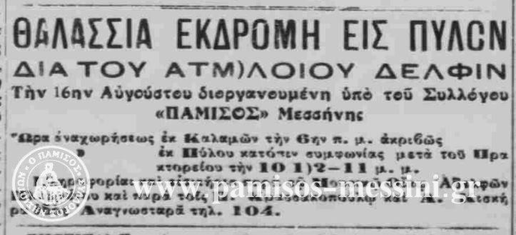 Διαφήμιση εκδρομής αυτή τη φορά, το 1931. Ο «Πάμισος» οργανώνει εκδρομή στην Πύλο και φυσικά οδικά δεν ήταν δυνατόν να φθάσει κανένας. Με το ατμόπλοιο «Δελφίνι» και αναχώρηση από την Καλαμάτα στις 6 το πρωί.