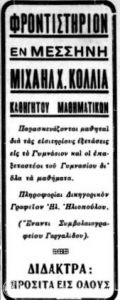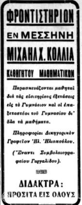 Το 1934 συναντάμε και πάλι διαφήμιση φροντιστηρίου του Μιχαήλ Χ. Κόλλια αλλά αυτή τη φορά «παρασκευάζονται μαθηταί δια τας εισιτηρίους εξετάσεις εις το Γυμνάσιον και οι επανεξεταστέοι του Γυμνασίου δι’ όλα τα μαθήματα»…
