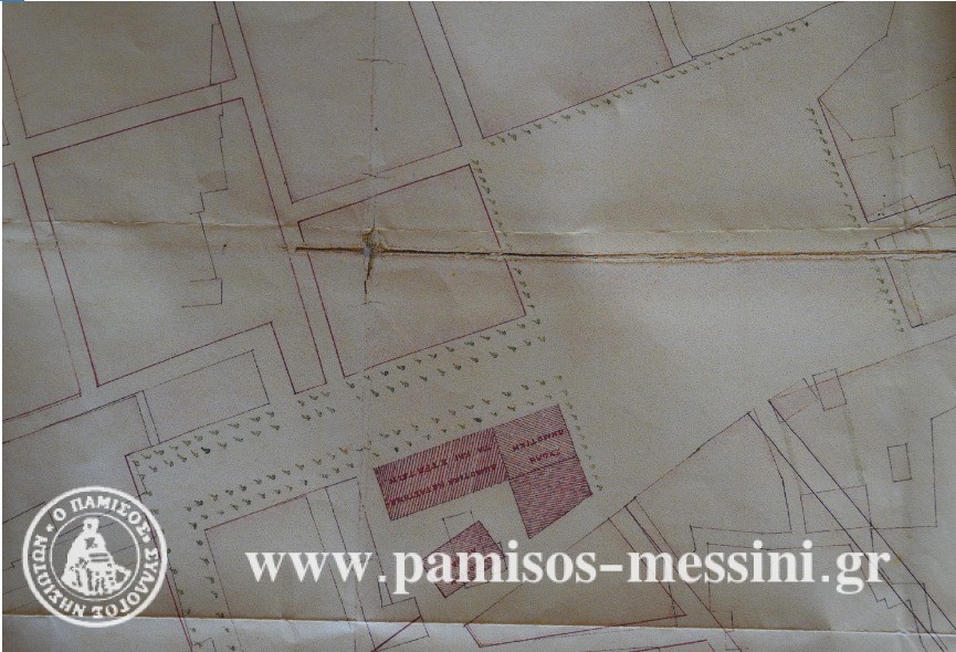 Πολύ ενδιαφέρον έχει το γεγονός ότι ο Βασίλης Ν. Βεργόπουλος (3) βρήκε και δημοσίευσε τη σύμβαση του δανείου μεταξύ δήμου και Λιμενικού Ταμείου, από το οποίο έχει σημασία να διαβάσουμε ένα κρίσιμο απόσπασμα: “Ο Δήμος Παμίσου παρέχει εις ασφάλειαν του συνομολογουμένου τούτου δανείου το εν τη πόλει της Μεσσήνης και κατά την πλατείαν της επάνω αγοράς κείμενα δημοτικά οικόπεδα εξ ών θέλουσι ιδρυθή τα εν τω ψηφίσματι (σ. σ. του δημοτικού συμβουλίου) ιδρύματα, συνεχόμενα άπαντα και αποτελούντα έκταση εκ πήχεων τεκτονικών περί τας δύο χιλιάδας, συνορευόμεναν ανατολικώς με δρόμον της αγοράς, δυτικώς ωσαύτη με δρόμον των αλωνίων, αρκτικώς με αλώνια των Καλαμαριωτέων και Ιωάννου Καρτερολιώτου και μεσημβρινώς με πλατείαν της επάνω αγοράς και με δημοτικόν εργαστήριον Ιωάννου Γυφτέα: επί των οικοπέδων τούτων κείται και η δημοτική σχολή των αρρένων επί ενός εργαστηρίου κειμένου κατά την πλατείαν της άνω αγοράς της πόλεως Μεσσήνη, και το οποίον οκτώ έτη δικαιώνεται να νέμεται ο Ιωάννης Γυφτέας, συνορευομένου ανατολικώς με πλατείαν της επάνω αγοράς, δυτικώς με δρόμον αλωνίων, αρκτικώς τα άνω περιγραφέντα δημοτικά οικόπεδα και μεσημβρινώς με δρομίσκον και οικίαν των αδελφών Αλεξάνδρου και Νικολάου Γεωργακοπούλων επί δύο ομοίων εργαστηρίων κειμένων κατά την επάνω αγοράν της πόλεως Μεσσήνης συνεχόμενων μεν αλλήλων και συνορευομένων ανατολικώς με κληρονόμων Αναστασάκου Χατζιέκου εργαστήριον, δυτικώς με είσοδον οικίας του Βασιλείου (Δ(ίζη (