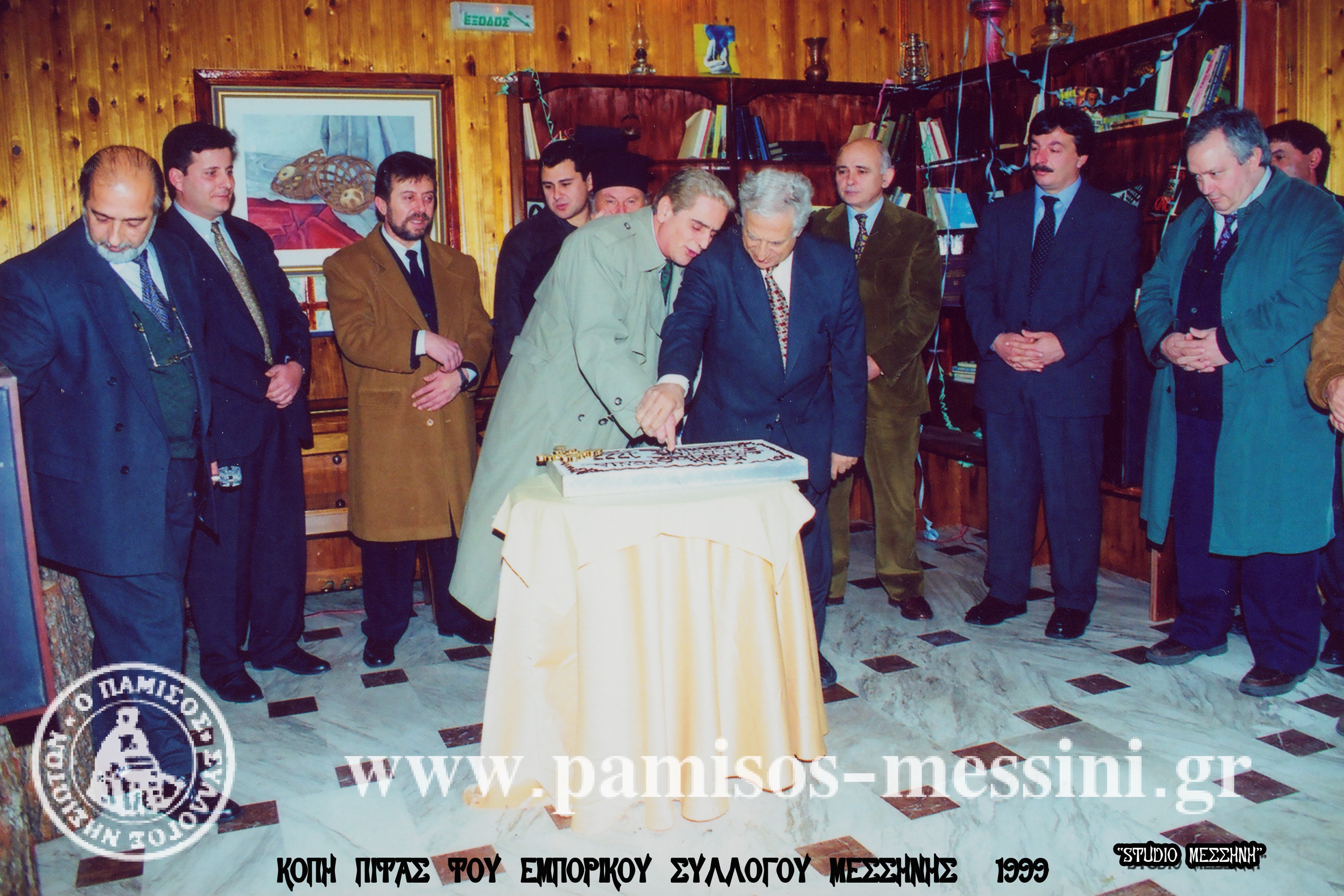 Από αριστερά Αρτέμης Φανός, Δημήτριος Τζώρτζης, Κώστας Παυλόπουλος, Πάνος Τσόλκας (μέλοι του Δ.Σ) Δημ. Δράκος (Νομάρχης Μεσσηνίας) Δημ. Σαμπαζιώτης (πρόεδρος του Νομαρχιακού Συμβουλίου) Γεώργιος Καραμπάτος (Πρόεδρος του Επιμελητιρίου)και σε πρώτο πλάνο ο πρόεδρος του Συλλόγου Δημήτριος Τσώνης με τον Δήμαρχο Μεσσήνης Παύλο Πτωχό κόβουν την πίτα.