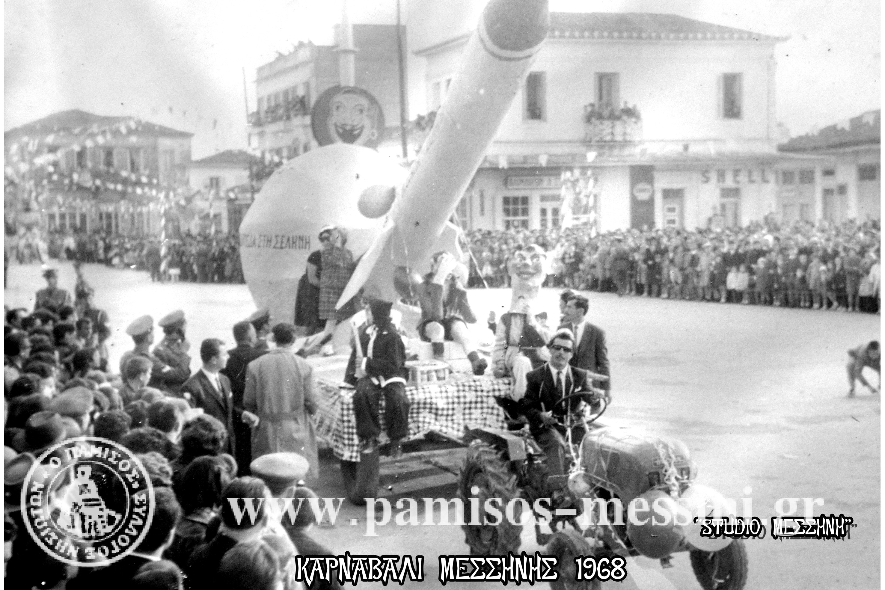 Καρναβάλι Μεσσήνης το 1968. Ο πύραυλος είμαι έτοιμος για τη Σελήνη. Τον μόνο που αναγνωρίζω είναι ο Γιάννης Πλεμμένος αριστερά στους χωροφύλακες κοιτάζοντας με προσοχή το άρμα