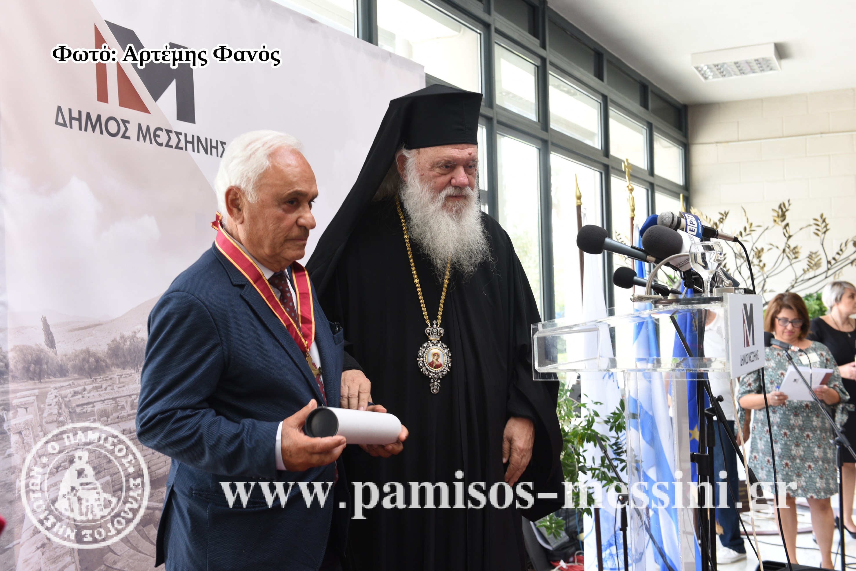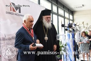Ο Αρχιεπίσκοπος Ιερώνυμος βραβεύει τον Καθηγητή Πέτρο Θέμελη.