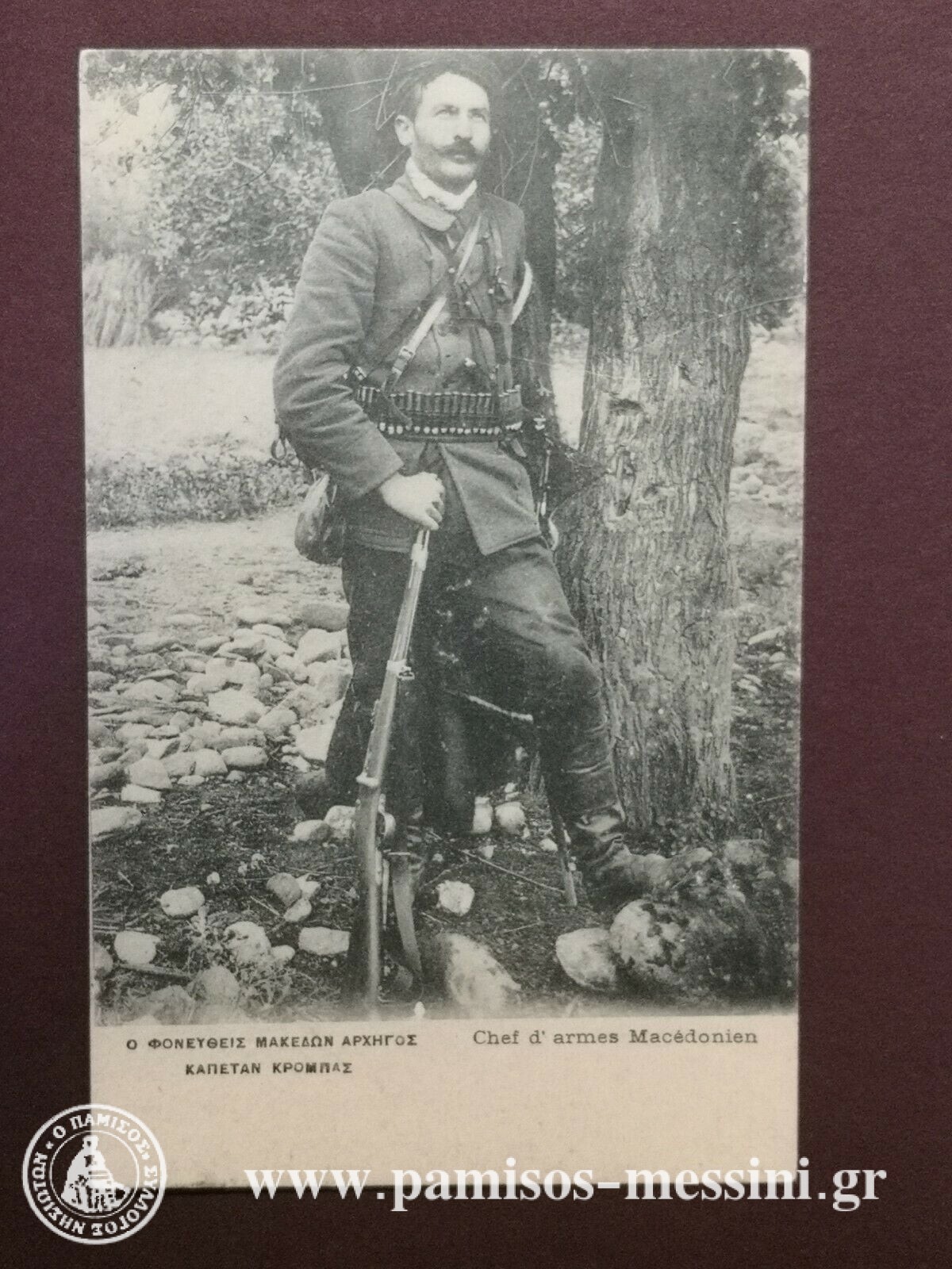 Χρόνια και χρόνια κάτοικος στην Καπετάν Κρόμπα και τα πέριξ στο Νησί, αργότερα ήρθε η τοποθέτηση της προτομής στο παρκάκι της πλατείας, μετά οι πληροφορίες για το Μαρίνο Λυμπερόπουλο. Και σήμερα τυχαία «έπεσα» πάνω σε μια καρτ ποστάλ που υπάρχει στο ηλεκτρονικό δημοπρατήριο e bay: «Ο φονευθείς Μακεδών αρχηγός Καπετάν Κρόμπας» (και δίπλα στα γαλλικά). Η φωτογραφία υπάρχει αλλά πολύ μικρή και παραμορφωμένη στο φωτογραφικό αρχείο του «Παμίσου», από σχετικό δημοσίευμα σε ιστότοπο. Και θεώρησα πως θα ήταν χρήσιμο να την δούμε σε κανονικό μέγεθος…