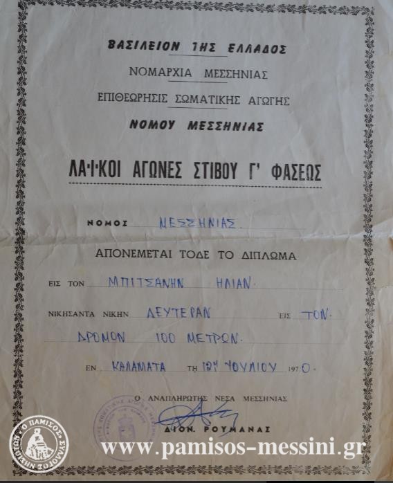 ΠΑΝΑΓΙΩΤΗΣ ΣΑΡΑΝΤΟΠΟΥΛΟΣ Ηλία μου θύμησες τον αγώνα που δώσαμε στην Καλαμάτα με το 2ο Γυμνάσιο αν δεν απατώμαι. Χάσαμε 2-0. Πράγματι ήμουν τερματοφύλακας, Πήγαινα στην Ε’ Γυμνασίου. Εσύ δεξί μπακ, ο Μιχάλης αριστερό και μάλλον σεντρεμπάκ πρέπει να ήταν ο συγχωρεμένος Αργυρόπουλος.»Λουμπούμπα». Για πρώτη φορά είχα αφήσει τις ελβιέλες και φόρεσα ποδοσφαιρικά παπούτσια που είχα δανειστεί από τον Πάμισο. Σ ένα μπλονζόν σε κείνο τον αγώνα μέσα στη λάσπη έγδαρα την αριστερή μου λαγόνα και το σημάδι μου τον θυμίζει ακόμα. Να σου θυμίσω επίσης και ένα αγώνα 400 μέτρων στο γήπεδο στο πλαίσιο των εσωτερικών αγώνων στιβου. Τρέξαμε εγώ, εσύ, ο Δημήτρης ο Μοσχοβίτης και ένας Παπαδόπουλος από τη Λάμπαινα πολύ γερός αθλητής. Μέχρι τα 300 μέτρα ήμουν μπροστά αλλά στην ευθεία με πέρασε και ο Παπαδόλπουλος (1ος) και εσύ (2ος) και αρκέσθηκα στην 3η θέση. Μάλιστα στην απονομή σε όλους έδωσαν στεφάνι ελιάς αλλά στην δικής μας απονομή δεν έδωσαν γιατί είχαν τελειώσει. Νασαι καλά ρε συμπαίκτη και συνάδελφε που τα σκαλίζεις και μυρίζουν όμορφα!!!