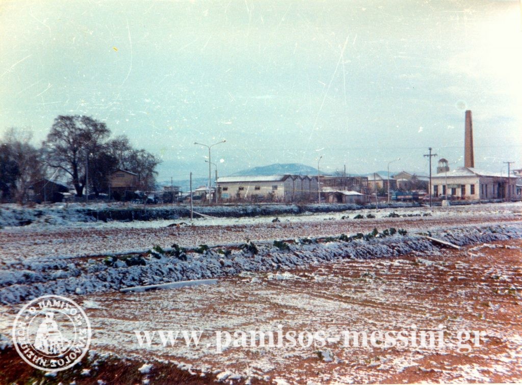 Η περιοχή του σιδηροδρομικού σταθμού της Μεσσήνης χιονισμένη το 1987 (;). (Φωτογραφία Τάκη Βαλαβάνη)