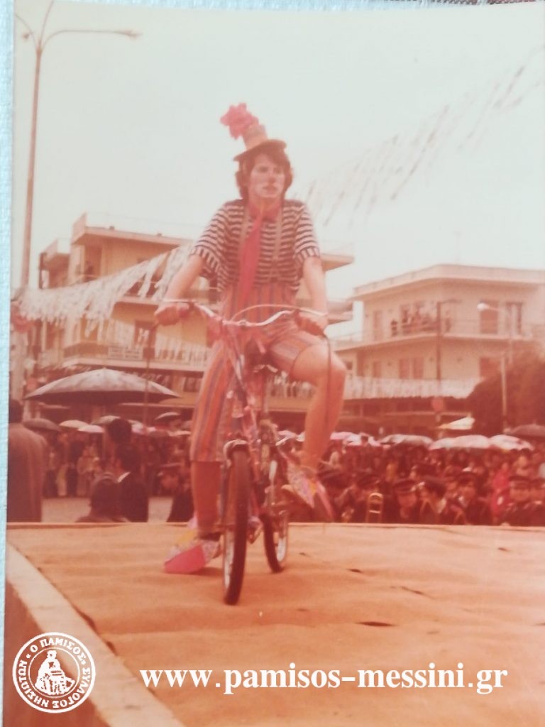 ΑΠΟΚΡΙΕΣ 1980 Δίνοντας και εγώ την παράστασή μου, στο καρναβάλι της πόλης μας, από την εξέδρα που ήταν στημένη στο μέσον της κεντρικής μας πλατείας, ντυμένος κλόουν, με το ποδηλατάκι μου, συμμετέχοντας στην μαντολινάτα του αείμνηστου Δημήτρη Κουτή.