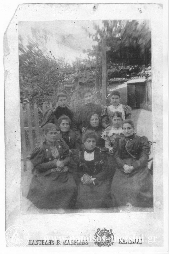 3.- Σπάνιο είδος φωτογράφησης ομάδας γυναικών. Στο κέντρο η Πηνελόπη Αθανασοπούλου, περιστοιχίζεται από οκτώ γυναίκες μικρότερης ηλικίας, όλες ντυμένες γιορτινά, με τη σοβαρότητα και την ακινησία των φωτογραφιών της εποχής, αλλά με μια μάλλον ευχάριστη έκφραση. Αδυνατούμε να κατανοήσουμε τον λόγο αυτής της συγκέντρωσης γυναικών του Νησιού γύρω από την καταφανώς αξιοσέβαστη Πηνελόπη. Ασφαλώς και δεν πρόκειται για συγκέντρωση μελών της οικογένειας, αλλά μάλλον για κάποια εκδήλωση κοινωνικού χαρακτήρα, ενδεχομένως και με μοναδικό σκοπό την ίδια τη φωτογράφηση. Οι καλοδουλεμένες και με άριστα υλικά (μετάξι κλπ.) ενδυμασίες των γυναικών, δείχνουν βέβαια ότι πρόκειται για μέλη εύπορων οικογενειών (σύζυγοι, κόρες), αλλά και πάλι, η αυτόνομη φωτογράφηση, δηλαδή εκτός του παραδοσιακού οικογενειακού πλαισίου, συνιστά μία εξαιρετική μαρτυρία για τα πολιτισμένα ήθη που επικρατούσαν στην πόλη. Οι γυναίκες είναι και ασκεπείς. Δεν φορούν ούτε το παραδοσιακό φεσάκι (όπως η Πηνελόπη) ούτε άλλο κάλυμμα της κεφαλής. Η χρονολογία της φωτογράφησης δεν είναι ακριβώς γνωστή, νομίζω όμως ότι μπορεί να τοποθετηθεί με αρκετή ασφάλεια στη δεκαετία 1890-1900. Ο φωτογράφος Παντελής Μακρίδης έχει έρθει βέβαια από την Καλαμάτα στο Νησί με τη φωτογραφική του μηχανή, ενώ η φωτογράφηση έγινε σε υπαίθριο χώρο (όπως και της φωτ. αρ. 2), υποθέτω στην αυλή της οικίας Αθανασοπούλου.