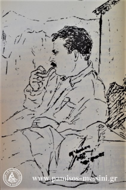 [Σκίτσο του Παναγιώτη Παπαγιάννη που φιλοτέχνησε στο χωριό Οξέ της Ικαρίας ο συνεξόριστος σπουδαίος Μεσσήνιος συγγραφέας Ομηρος Πέλλας (Οδυσσέας Γιαννόπουλος) από τον Πρόδρομο Τριφυλίας έγκλειστος των Γερμανών στο στρατόπεδο “Παύλου Μελά” και στη συνέχεια όμηρος σε στρατόπεδο συγκέντρωσης στη Γερμανία, που έχει γράψει το συγκλονιστικό “Stalag VI C”]
