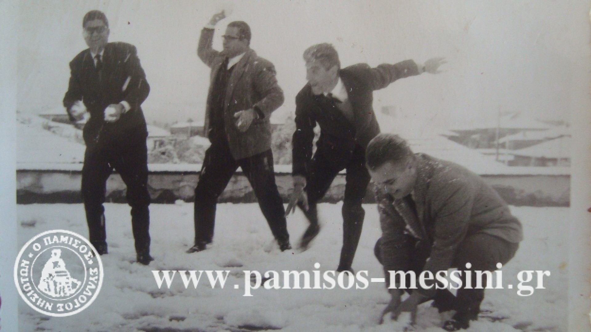 Τέτοιες ημέρες το 1968, ισχυρή χιονόπτωση (και) στο Νησί, οι στέγες των σπιτιών τα λευκά, υπάλληλοι στην ταράτσα της Ενωσης Συνεταιρισμών σε… χιονοπόλεμο: Από αριστερά Τάκης Νικητόπουλος, Αριστείδης Αθανασόπουλος, Βαγγέλης Μπιτσάνης, Παναγιώτης Ηλιόπουλος.