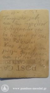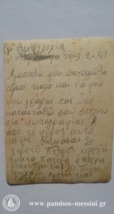 Με πλοίο φτάνει στην Αμφιλοχία (Κραβασαράς). Φωτογραφίζεται (3 Φλεβάρη ’41) μαζί με άλλους στρατιώτες… σίγουρα Νησιώτες (αλλά ποιοι;) και γράφει λίγα λόγια -λογοκρισία- και πολλά χαιρετίσματα (σύμφωνα με παρελθοντική συνήθεια -ονομαστικά!-) σε 8 συγγενικά πρόσωπα.