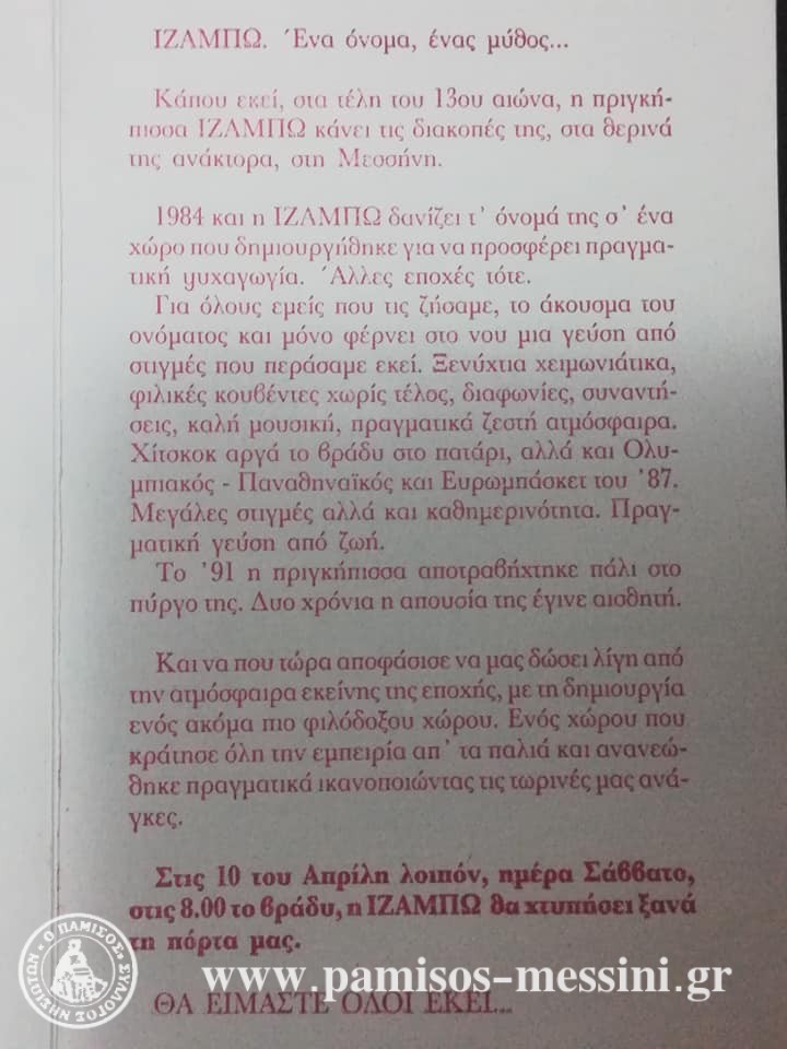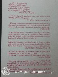 Φώτο 1 : Η δεύτερη σελίδα της πρόσκλήσης των εγκαινίων, με αναφορές στην πόλη μας την Μεσσήνη, από τον Ευριπίδη στο «Κρεσφόντη», από τον Παυσανία στα «Μεσσηνιακά», αλλά και για το ποτάμι μας, τον Πάμισο από τον Στράβωνα και πάλι τον Παυσανία στα «Μεσσηνιακά», όπως φυσικά, πως θα  γινόταν άλλωστε και για την πριγκίπισσά μας την » ΙΖΑΜΠΩ», από το Γαλλικό χρονικό και τον τόμο των » Μεσσηνιακών» (1969-1970 σελ. 156).