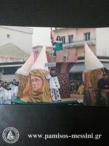 Το άρμα συνόδευε πεζοπόρο από το 2ο Γυμνάσιο Μεσσήνης, με θέμα στις στολές τους, αρλεκίνοι.